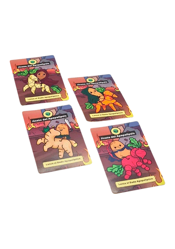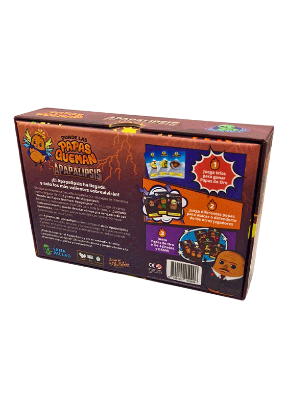 ¡El Apapalipsis ha llegado, y solo los más valientes sobrevivirán! En esta emocionante secuela, la batalla por las papas se intensifica con la llegada de los 4 Jinetes del Apapalipsis, quienes traen consigo el Dado Apapalíptico, agregando aún más emoción y locura al juego. Además de reuniendo las Papas de Oro, ¡Junta en tu mano los 4 jinetes y gana automáticamente!
