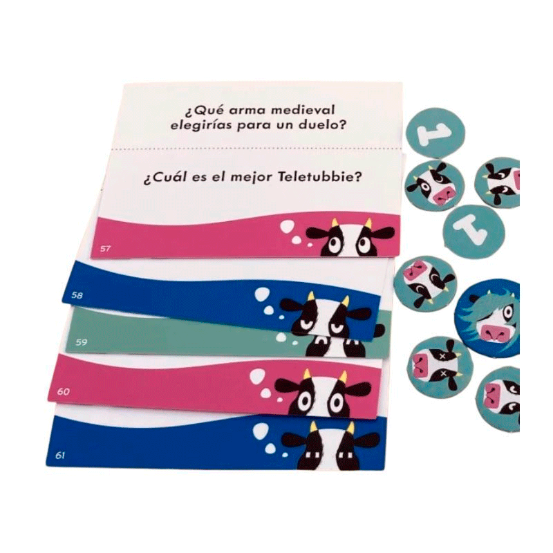 El primer jugador en conseguir 8 fichas de vacas ¡es el ganador! Un party game para familias, amigos y ¡vaqueros!