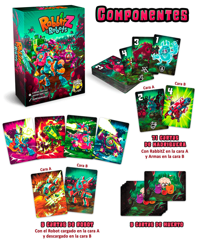 RabbitZ & Robots es un juego de Lorena Gestido y Javier Martínez e ilustrado por Bambinomonkey. Si al final de la invasión eres el jugador con menos puntos negativos en su Huerto, serás el ganador.